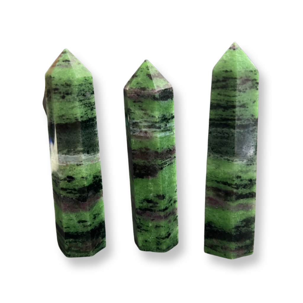 When Ruby and Zoisite are naturally combined into a single stone, the root, heart, and third eye chakras are all aligned and harmonize on the same vibrational level. This special combination of stones will help in the manifesting of ideas and will offer the strength and assistance in accomplishing your dreams. Ruby Zoisite aligns the heart and third eye to produce a deepened understanding of what negativity we are carrying and how to conquer it. Ruby Zoisite is also one of the very few minerals that can transmute negative energies into positivity. Even leaving a piece in your daily environment will drastically benefit everyone in it.