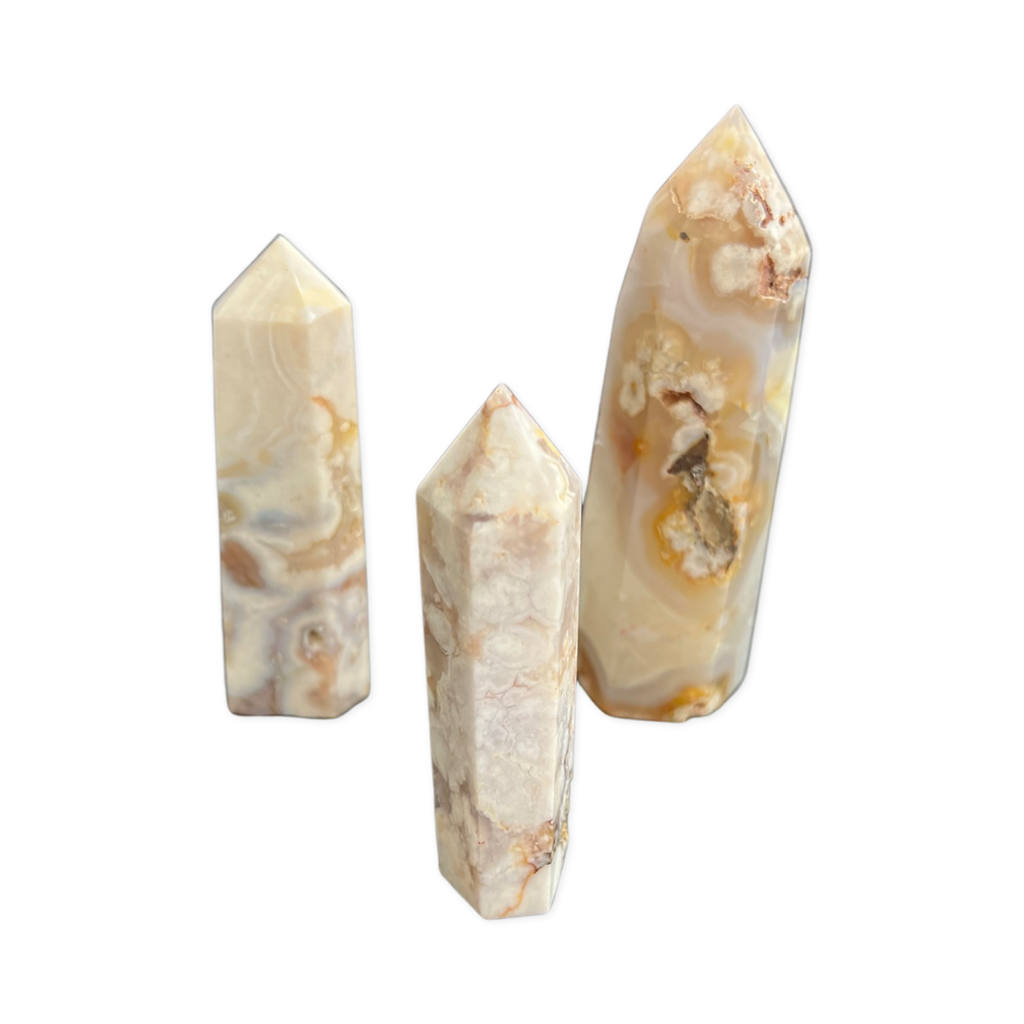 Cherry Blossom Agate, also known as Sakura Agate or Flower Agate, can be described as an energy that helps in "reblooming" after painful or exhausting periods in life. It has the heart-focus of pink chalcedony, but its energy is punchier.